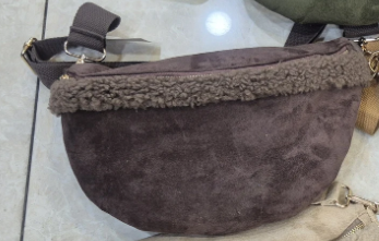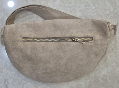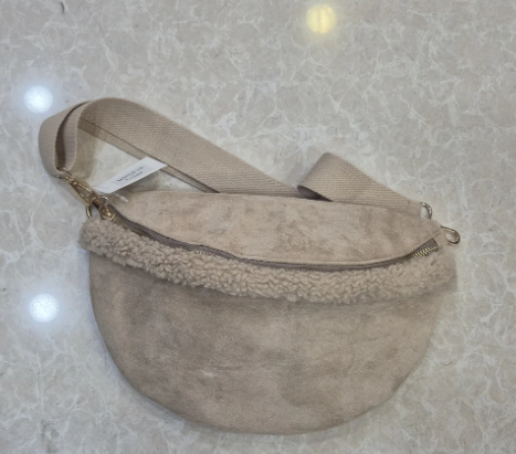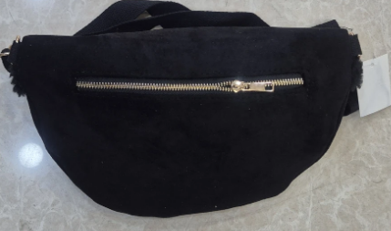 Sac banane synthétique en style daim avec une finition en moumoute. Le sac comprend une poche intérieure et une poche à l'arrière. 100% Polyester. Dimensions : 28x18cm