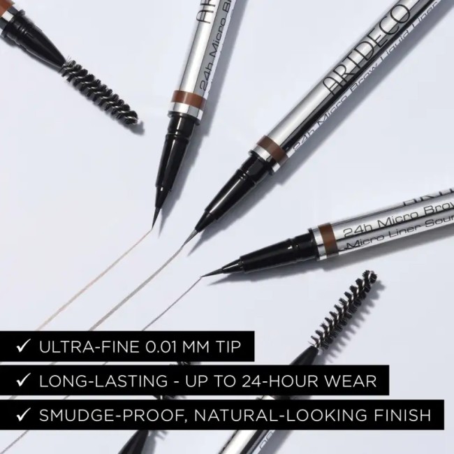 Définissez et sculptez vos sourcils ! Le Micro Brow Liquid Liner 24h d'ARTDECO vous définit et sculpte vos sourcils à la perfection. En effet, sa pointe ultrafine et flexible de seulement 0,01 mm de diamètre vous permet de l'appliquer avec une très grande précision. Qu'il s'agisse de lignes fines ou épaisses, ce liner imite parfaitement l'apparence des poils naturels. Dessinez des poils de sourcils fins et naturels aux endroits où vous souhaitez les étoffer. Le résultat ? Un fini parfait et totalement naturel !