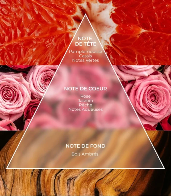 Les bois ambrés viennent structurer la composition et prolonger le sillage dans une atmosphère chaleureuse et enveloppante, apportant profondeur et élégance à la fragrance.
